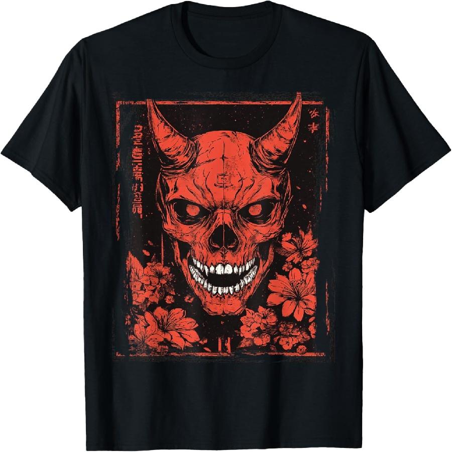 T-shirt z twarzą demona i czaszką, japońska sztuka, diabeł Oni, estetyka Harajuku(4)
