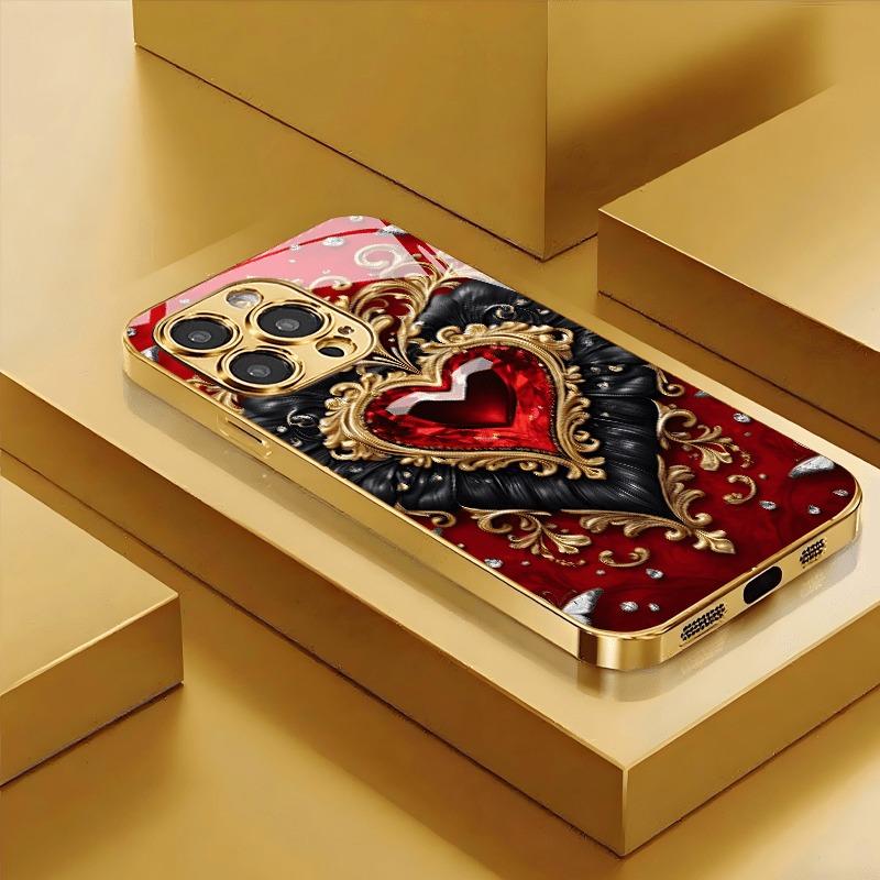 Złoty Wzór Serca Złoty Metaliczny Lakier Hartowane Szkło Etui na Telefon Dla iPhone 11 12 13 14 15 16 17 Pro Max Plus 17 Air 16E Pokrowiec