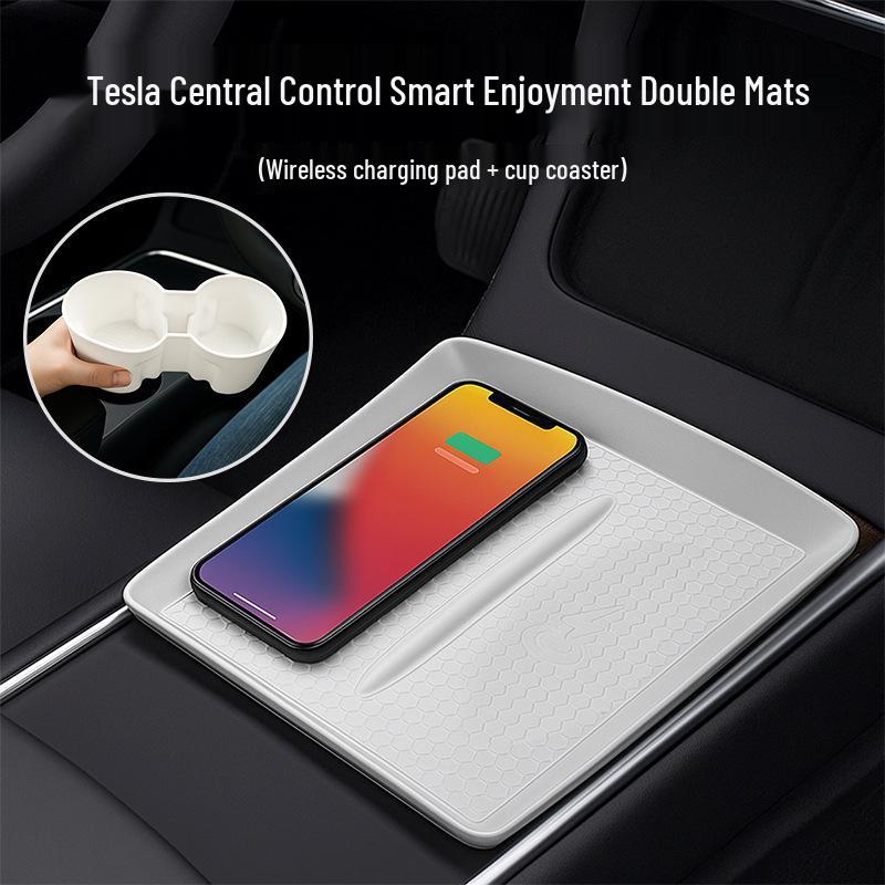 Tesla Car Center Console Silicone Coaster & Wireless Charger Cup Holder Storage Box
