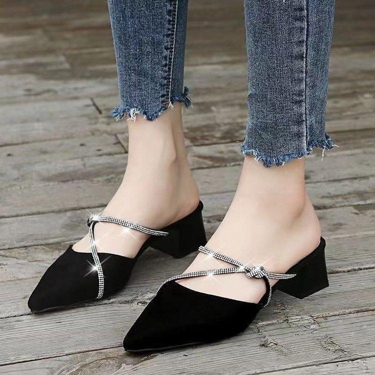 Sandały letnie z noskiem i cyrkoniami, na średnim obcasie, z zakrytymi palcami, nowe, na grubszym obcasie, codzienne i wygodne, z jednym paskiem na palce