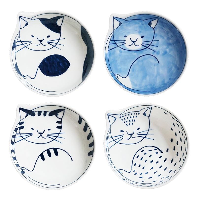 Hasami ware coneco cat-patterned bowl and plate set of 4. A great gift for cat lovers. Microwave and dishwasher safe. Made in Japan. Product code: