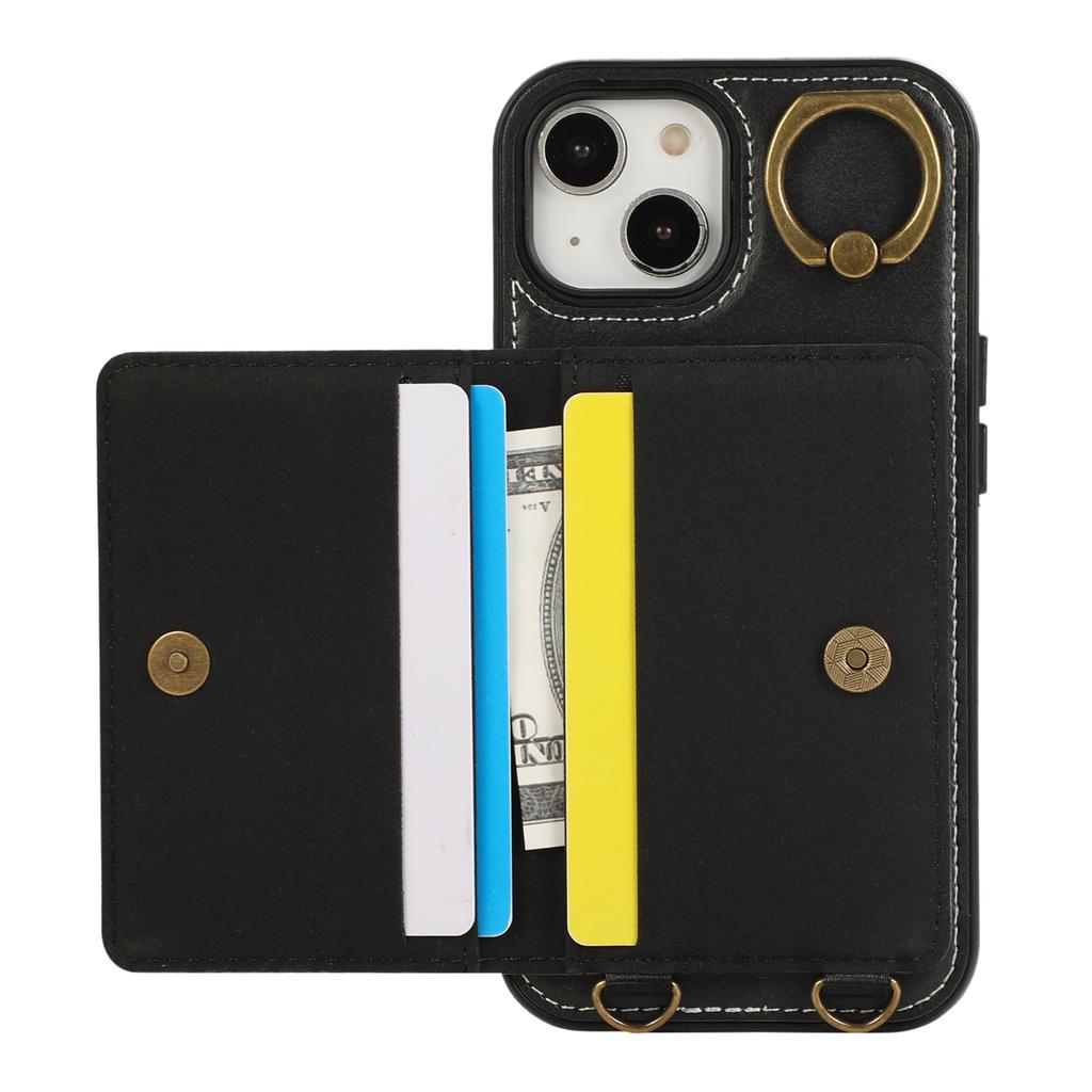 For iPhone 14 PU Leather Back Case Card Holder Kickstand Phone Cover with Wrist Strap