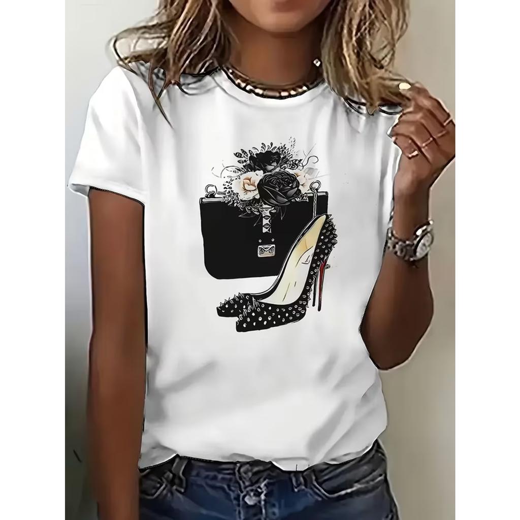 Stylowy damski T-shirt z nadrukiem słodkiego portfela i butów na wysokim obcasie, Codzienny top z krótkim rękawem i okrągłym dekoltem