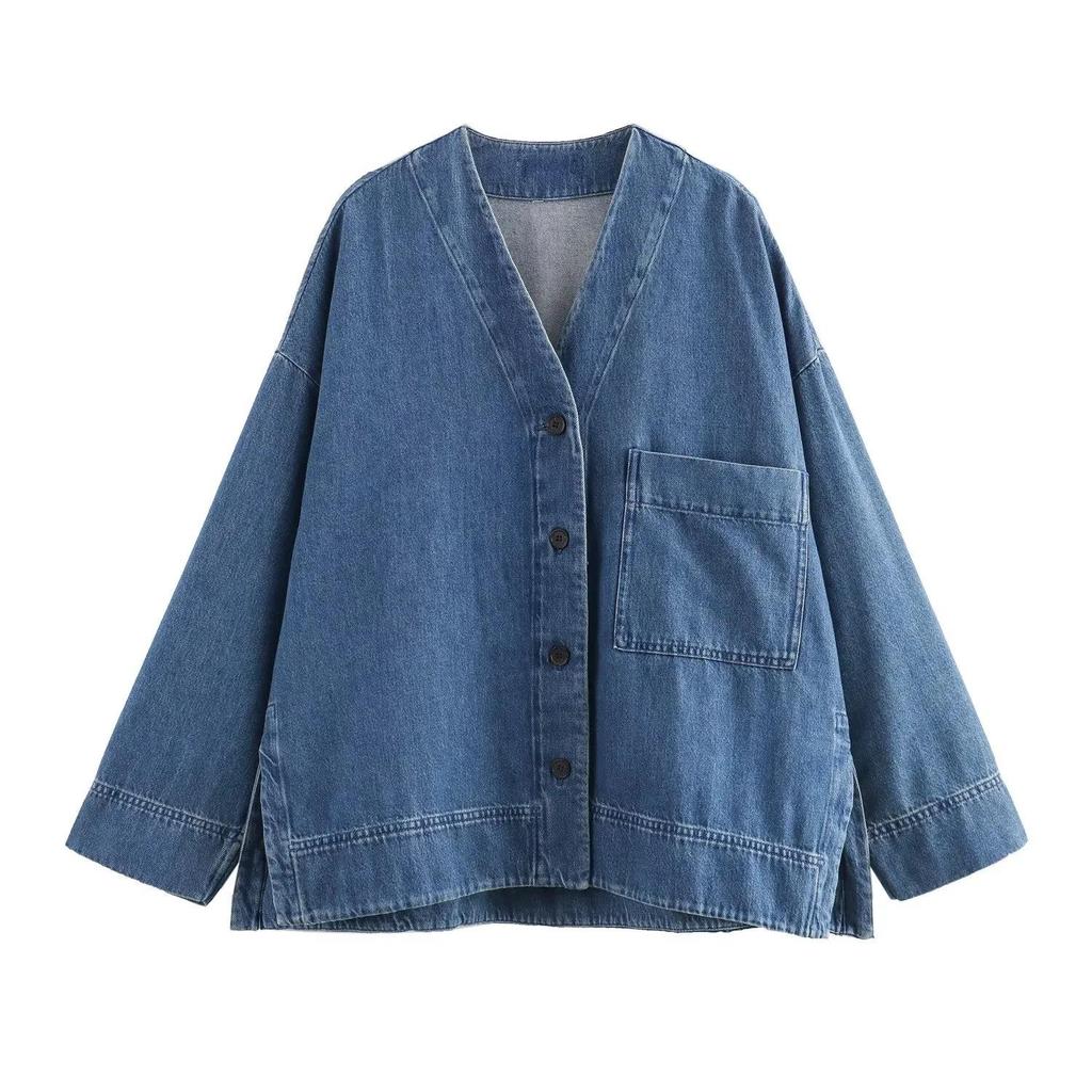 Europejska & Amerykańska Damska Moda Jeansowa Koszula z Obniżonymi Ramionami i Kołnierzem