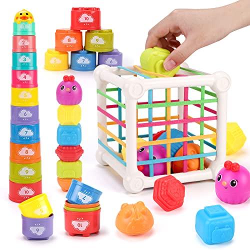 Qizebaby Baby & Toddler Toy, Fat Brain Fingertip Educational Toy & Combi Cup Stacking Game, Montessori Bath Toy, Shape Recognition, Color Recognition,