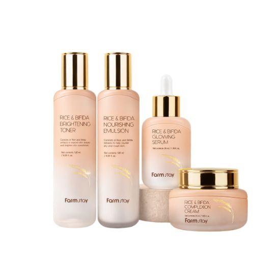 Farmstay Rice & Bifida Skincare Set Brightening & Nourishing 4-Piece Set (Toner 120ml + Emulsion 120ml + Serum 35ml + Cream 55ml)
