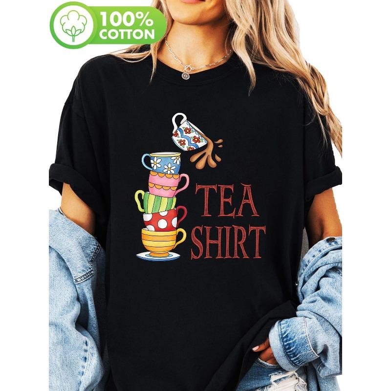 Urocze i Interesujące Filiżanki do Herbaty Umieszczone Wśród Stosu Wysokich Kubków, Koszulki z Nadrukami, Casualowe Topki z Krótkim Rękawem i Okrągłym Dekoltem, na Lato i Wiosnę,